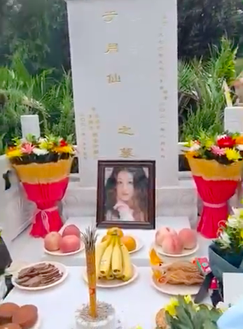 于月仙的墓是夫妻合葬墓,墓碑上刻着她和张学松两个人的名字。墓碑前摆放着于月仙的遗照,选择的是她年轻时候的照片,披散着一头秀丽卷发,肤白貌美气质出众。案台上还放着许多水果,还有她爱吃的零食。