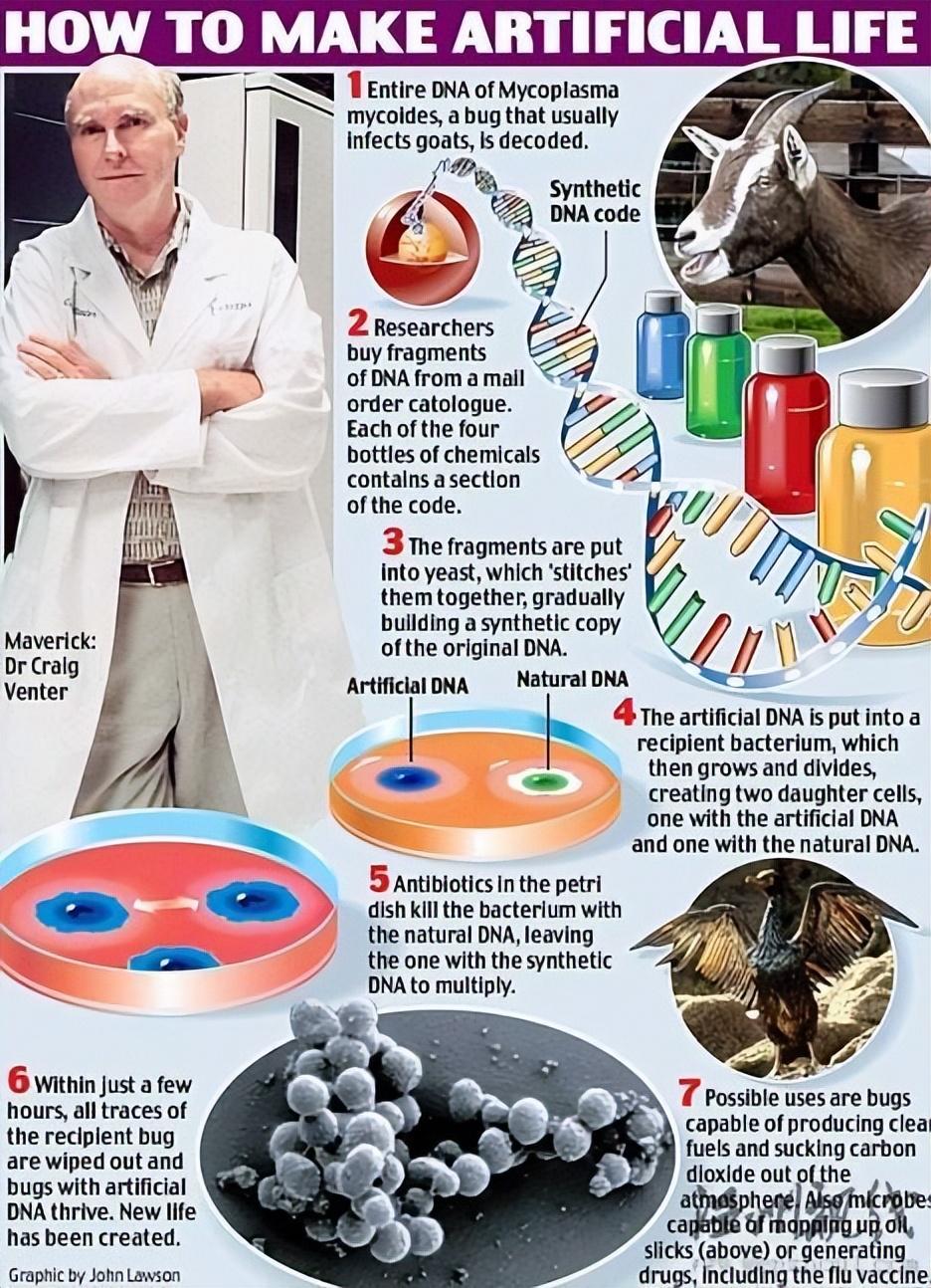 2010年5月20日,美国科学家宣布世界首例人造生命——完全由人造基因控制的单细胞细菌诞生,并将它命名为“人造儿”。这项具有里程碑意义的实验表明,新的生命体可以在实验室里“被创造”,而不是一定要通过“进化”来完成。