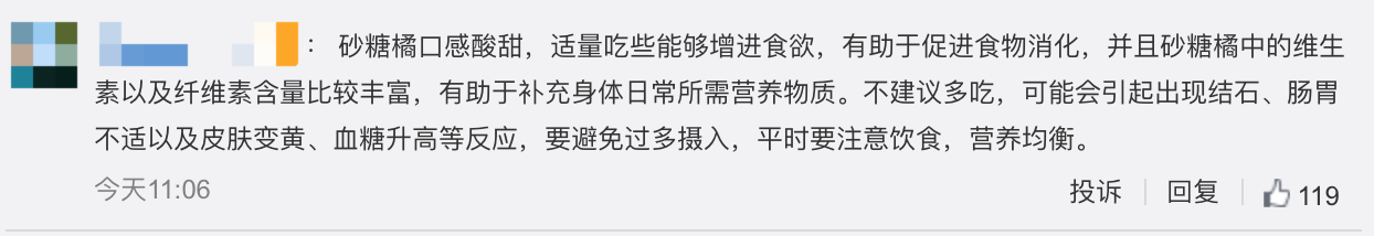 也有网友温馨提示吃砂糖橘要有度,否则会变小黄人,“砂糖橘口感酸甜,适量吃些能够增进食欲,有助于促进食物消化,并且砂糖橘中的维生素以及纤维素含量比较丰富,有助于补充身体日常所需营养物质。不建议多吃,可能会引起出现结石、肠胃不适以及皮肤变黄、血糖升高等反应,要避免过多摄入,平时要注意饮食,营养均衡。”